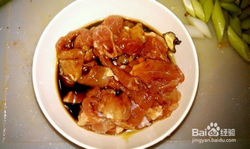 将所有食材的准备好。肉丁加入一勺蚝油和酱油腌制3分钟.