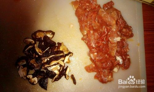 香菇用温水泡10分钟。然后将香菇洗净切丝、肉切丁。