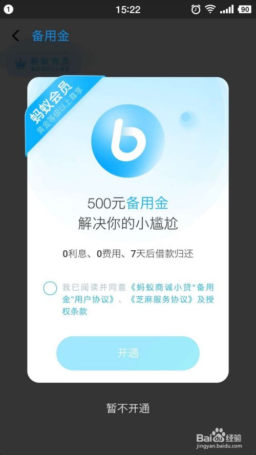 点击就进入备用金的界面啦,当第一次进入时,会提示让你开通。我们勾选同意,点击开通。