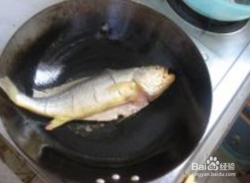 黄鱼表面摸淀粉,放入烧热的油锅两面煎香
