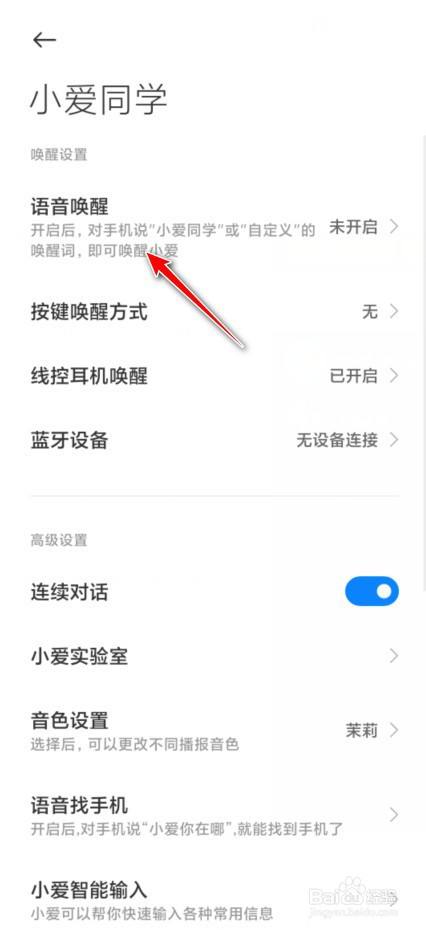 打开语音唤醒的按钮,可选择默认的小爱同学语音或者自定义唤醒词。