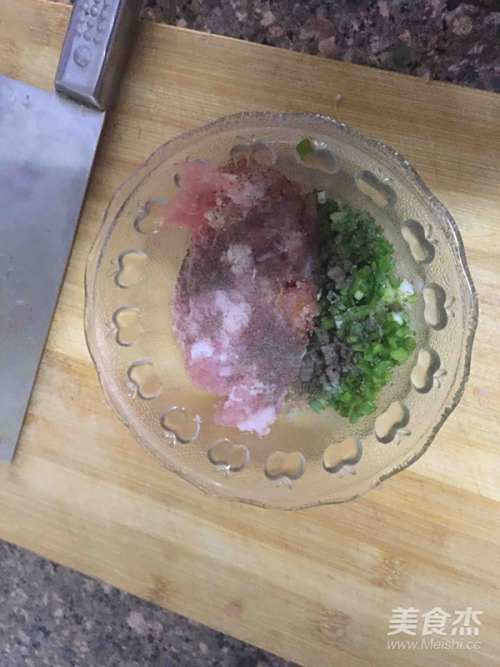 1五花肉剁成肉末,香葱切末,然后混在在一起加少许盐,胡椒粉,生抽,淀粉,料酒搅拌均匀制成肉馅备用