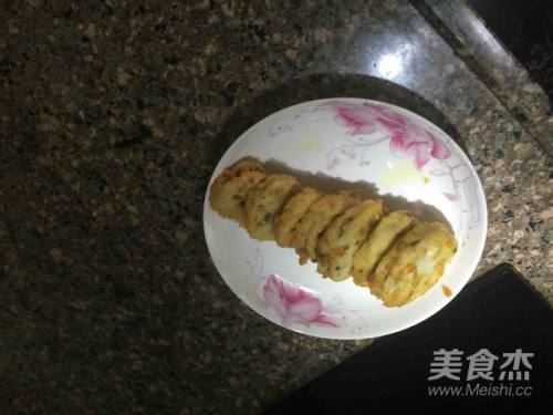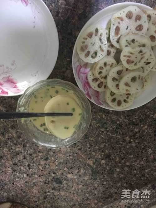 5然后将塞好肉馅的藕夹挂上鸡蛋面粉糊,最后放入已经烧热的油锅中小火煎炸