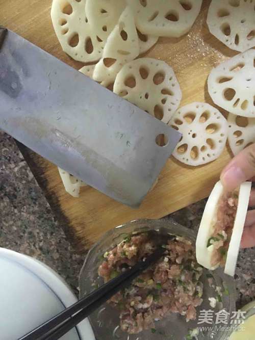 4将全部切好的藕夹里塞肉馅捏平夹紧