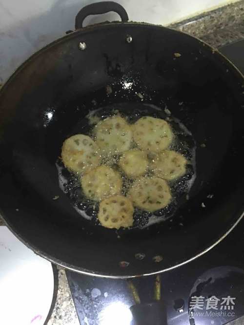 6油炸中,藕夹需要翻面,炸至金黄色起锅END