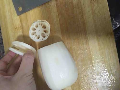 3藕去皮洗净,切成中间不断的藕夹,如图,可用两根筷子分别放置于藕段两边用刀切便不容易切开