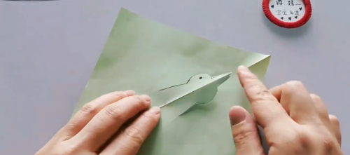2剪刀剪出大雁头部后,把彩纸打开,另一面也画出画线。