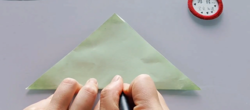 1彩纸沿对角折叠,中间部位画出大雁的头部。