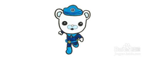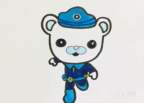 先画出一顶帽子,接着往下画出巴克队长的头部,画出它奔跑着的姿势和穿着制服的身体,将眼睛和嘴巴涂黑,耳朵与鼻子部分用浅蓝涂上,腰带上的部件涂黄,最后将衣服帽子整体用蓝色与暗蓝色组合涂色,机智的巴克队长就画好啦。