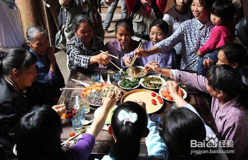 茶水主要是冰糖茶、桌上另备多种甜、咸、瓜果等食品,山里人尊老,客人们到齐后,长辈中年纪大的人坐“大位”,他们这里的风俗又跟我们江南不同,我们八仙桌是坐8个人的,他们是每张凳子坐3个人,大家依次坐下后,主人家就忙着上热菜了,也是些农家平常食用的蔬菜类。