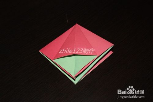 利用折痕收折纸张,压平放置(红颜色朝上),如下图所示。
