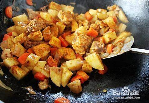 加入土豆块炒匀后加咖喱粉,青椒不停翻炒