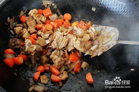 加入鸡肉翻炒,加些料酒后将肉炒白后加入胡萝卜