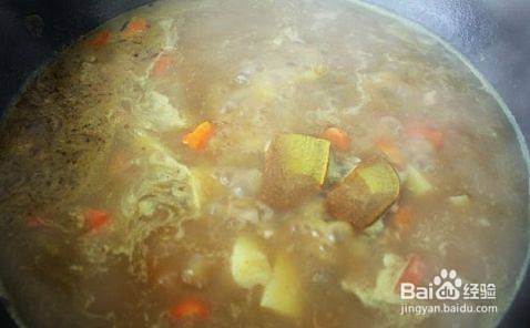 加入2碗水,等水烧开后放入咖喱块煮至里面蔬菜烂