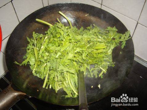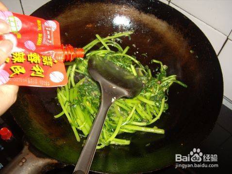 第6步:炒至断生,加适量蒜蓉辣酱炒匀即可
