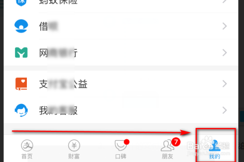 在支付宝首页的右下方找到我的选项,点击进入支付宝我的主页面。