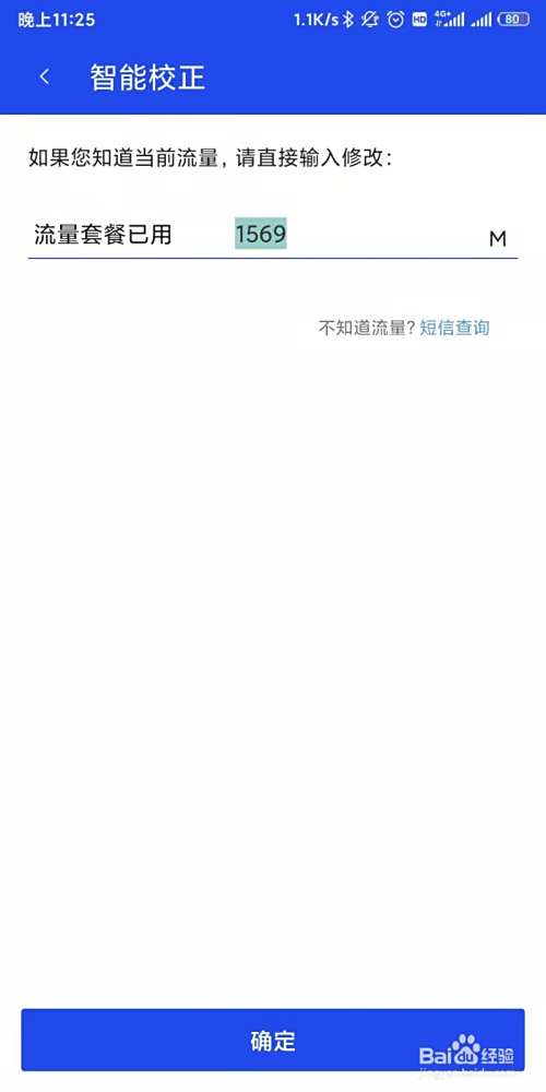 如果知道当前流量,可以直接输入修改以用流量套餐值,然后点击确定按钮即可,如果不知道可以点击“短信验证”查询校正。