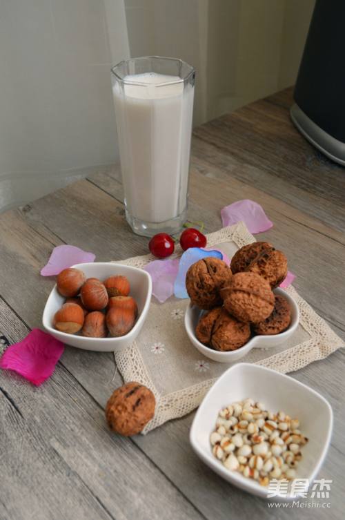 1将所有材料准备好,薏米煮熟,榛子核桃去壳。