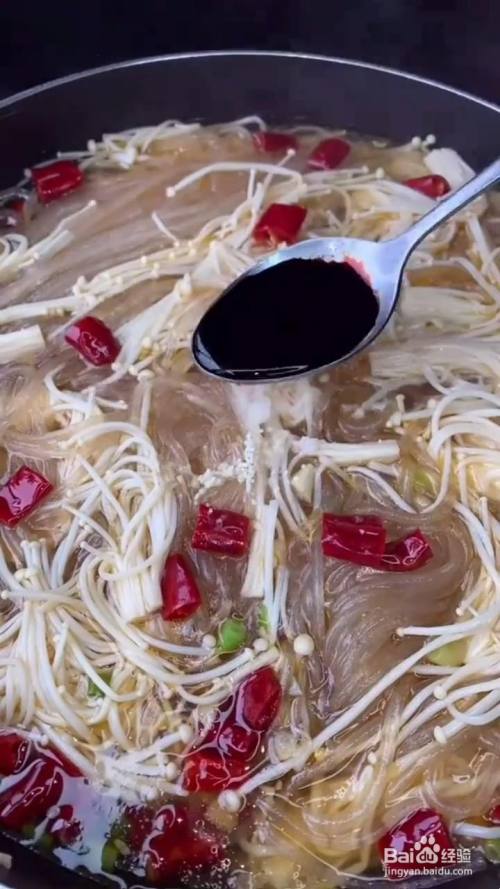 放上金针菇,泡好的粉条,加盐,鸡精,老抽