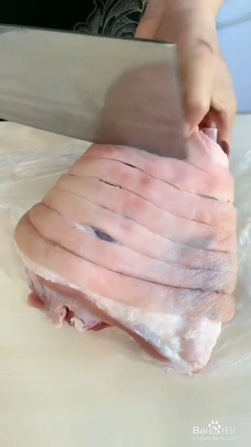 我们将大肘子处理干净,表面改花刀冷水下锅,加入料酒,煮出血沫后捞出洗净放入高压锅中