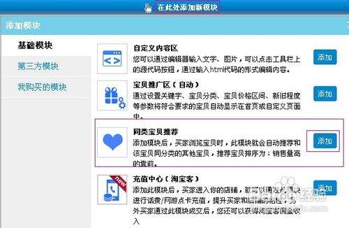 在右侧模块点击在此处添加新模块——添加“同类宝贝推荐”