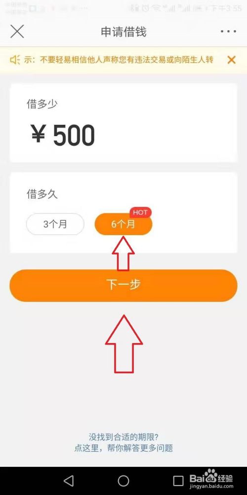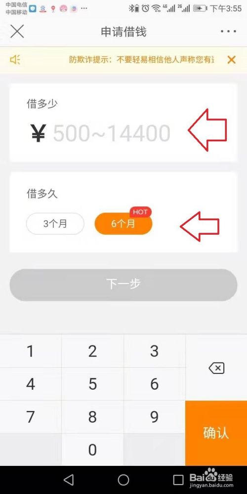 进入后,输入需要借钱的具体数额,点击选择需要借钱取现的分期次数,点击确定点击下一步。