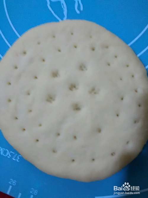 和好口后再用擀面杖轻轻的擀均擀圆,用牙签在表面戳几个洞洞