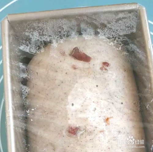 接下来密封发酵,发酵好的面胚,排气整形,放在模具里二次发酵,用保鲜膜覆盖。