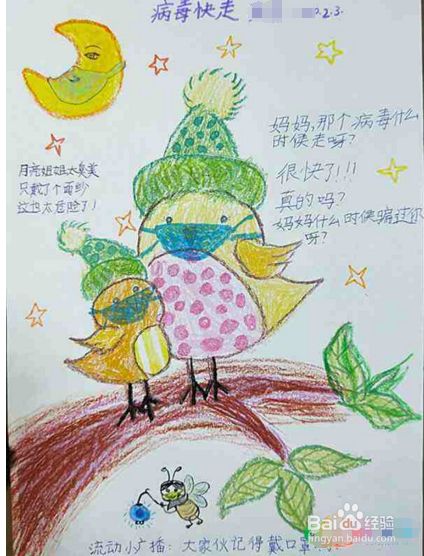 左上角画上一个黄色的月亮,月亮姐姐也戴上了口罩,近处,枝头的树梢上面,小鸟和妈妈也都佩戴了口罩,它们一起抵抗病毒。