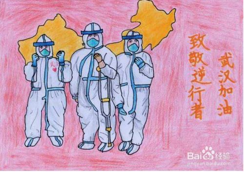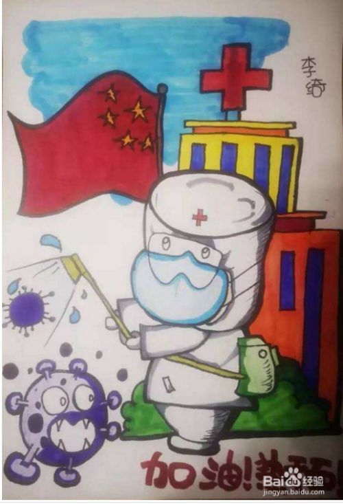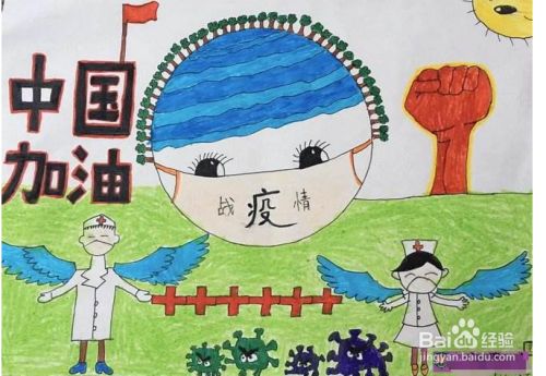 最上方写上中国加油,中间画上一位戴口罩的医生,周围是可怕的病毒。我们不怕病毒,积极应对。