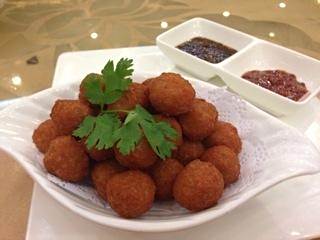 弄好上述步骤下面就是油炸了,放入能淹没全部肉丸子加一手掌的油(花生油比较香),先把油炸至金黄再放入油丸子,炸3-5分钟就可以上碟了。
