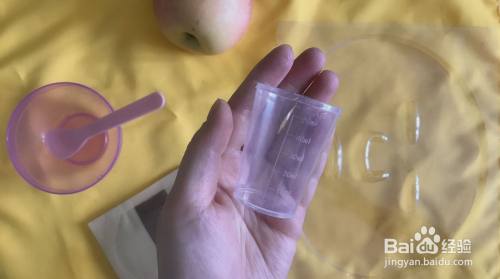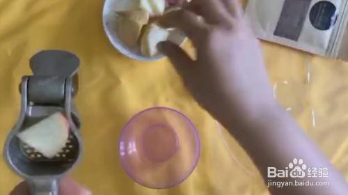 把苹果切成块,用压汁器把小块的苹果压成汁,把苹果汁收集在小量杯里。