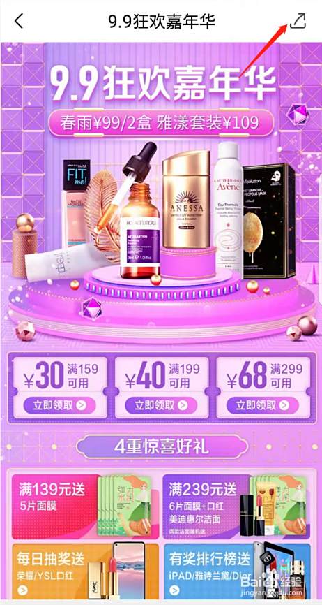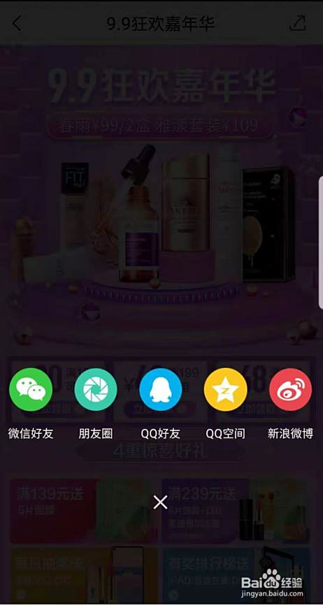 第三步:进入到活动主页后,可以#领取#满减优惠券#参与此次活动,然后点击主页右上方的分享按钮,即可通过#微信#/#QQ#/#微博#等不同的方式将活动分享给别人。