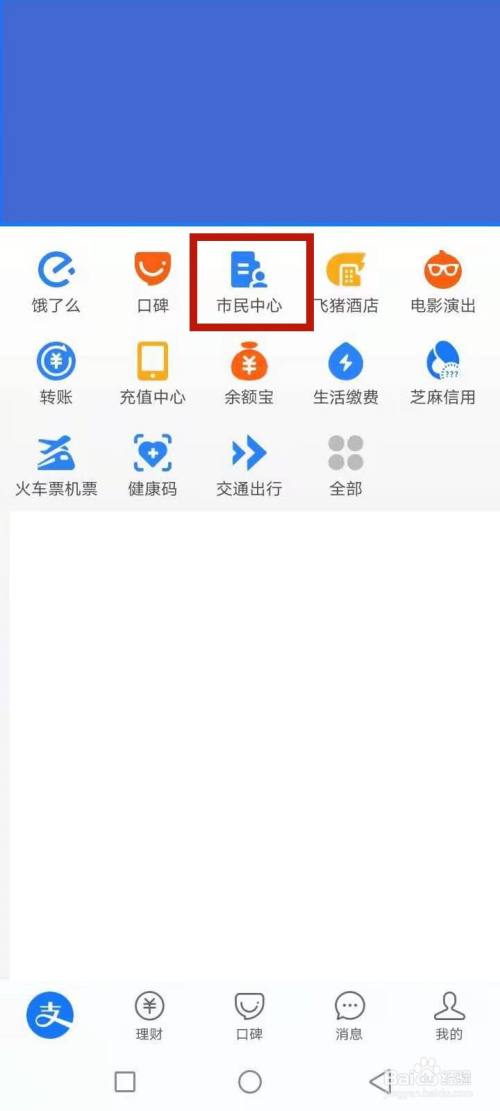 手机打开支付宝app,点击市民中心,如图红色文本框: