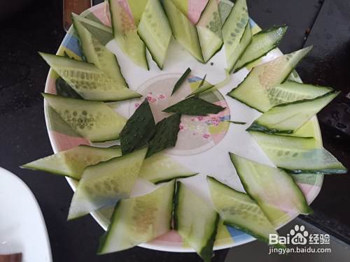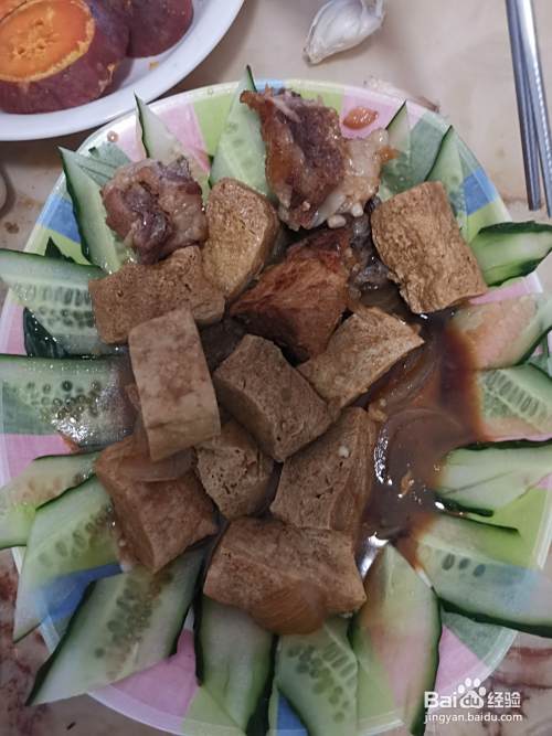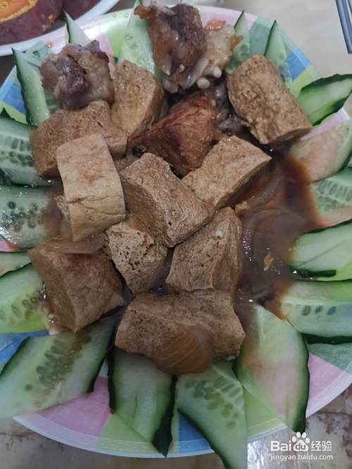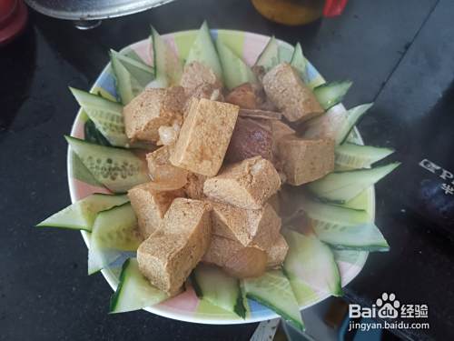 黄瓜片摆盘后,倒入顿好的冻豆腐即可上桌食用