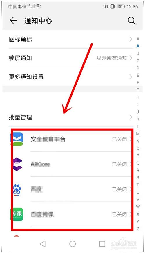 华为手机呼吸灯设置第六步:返回到“通知中心”页面,在批量管理下方,找到你要设置的某个应用,点击打开。