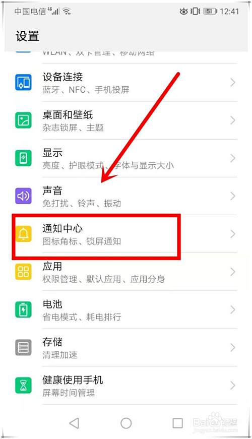 华为手机呼吸灯设置第二步:在设置页面中,找到“通知中心”选项,点击进入。