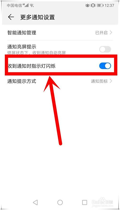 华为手机呼吸灯设置第四步:根据需要打开或关闭“收到通知时指示灯闪烁”选项后面的开关按钮。打开,收到通知指示灯则会闪烁,否则指示灯不闪烁。