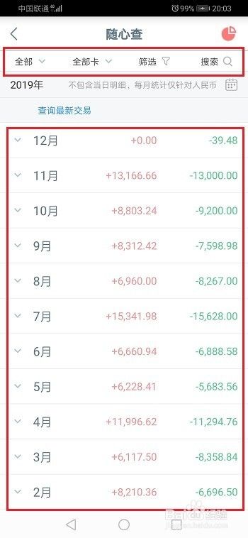 第三步进去随心查界面,可以看到每个月的收入和支出情况,如下图所示:
