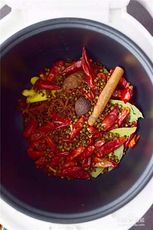 第三步,将电饭煲按到煮饭键,内胆烧热倒入少许油,把所有的香料倒入锅中,炒出香味。