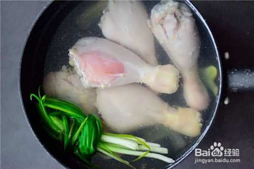 第二步,锅中放入生姜片、小葱烧开,鸡腿放沸水中过一遍,捞出放入凉水中放凉