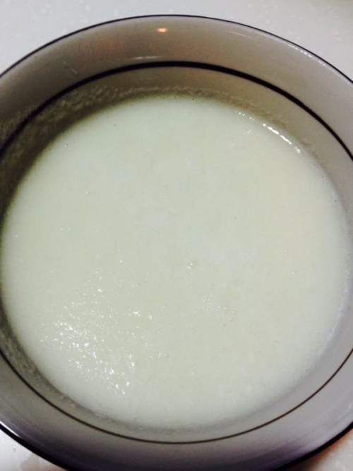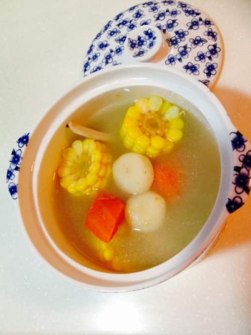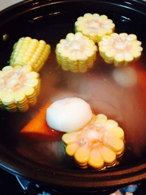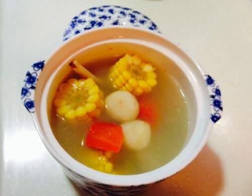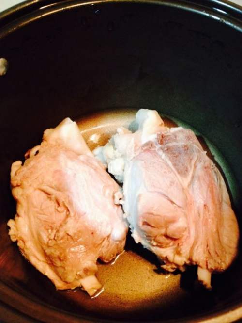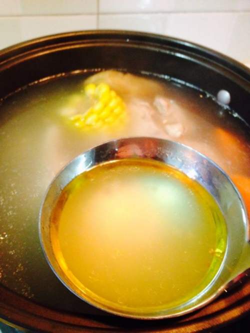 6两到三小时后,撇油、去杂质,放入马蹄汁儿,加盐、冰糖、白胡椒粉;续煲一小时。