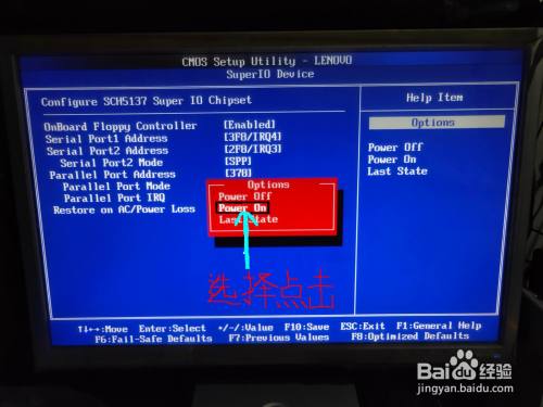 会出现三个关于设置来电开机方式的选项,我们选择中间的一项, 即Power On 也就是电脑在通电后,能够自动启动开机运行的功能选项参数.按Enter键选中
