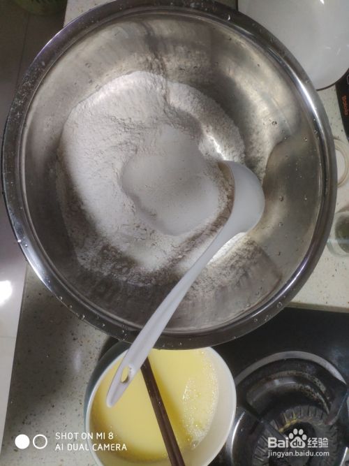 缓慢倒入鸡蛋水,边倒边朝一个方向搅动,然后和成一块面,盖上盖子醒着。