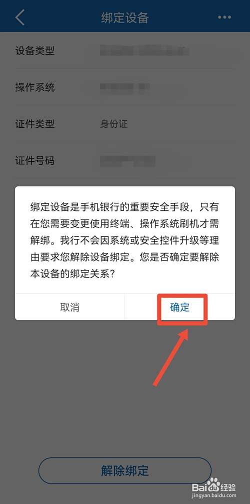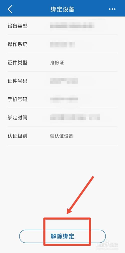 进入绑定设备界面,核实设备类型,操作系统,证件号码,手机号码,绑定设备无误,点击解除绑定