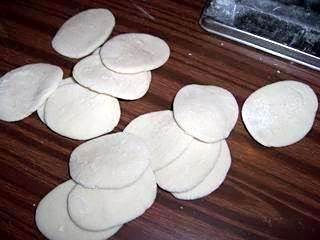 将面团放在案板上,撒些干面粉,搓长圆条,揪10个面剂,按扁,擀成圆皮,包人馅,收口捏拢,剂口朝下,按成圆饼。