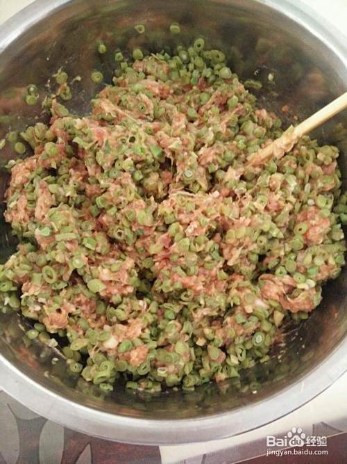 2.将牛肉洗净,去除筋膜,剁成碎末,放入盆里,加入精法,朝一个方向搅拌,边搅边加入清水,搅至肉末变色、黏稠时,加 加入葱末、姜末、黄酱、芝麻油,搅匀成馅。