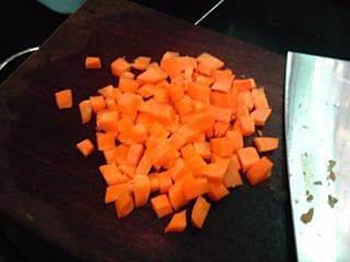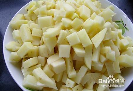 把土豆去皮切成丁,胡萝卜洗清切成丁备用;