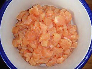 首先把鸡肉切成丁,放几滴料酒去腥,打入一个蛋清搅拌均匀,放到一边备用;