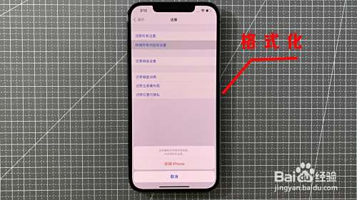 打开设置;找到通用;选择还原;选择抹掉所有内容和设置。格式化为了保证机器能达到一个最原始的状态,防止一些技术手段篡改数据。